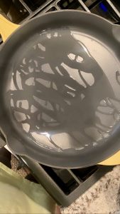 - Carefully transfer plantain-breaded halibut to heated cast iron skillet skin side down. Fry for about 6 minutes, or until about halfway cooked and crispy. This will depend on the thickness of your filet.